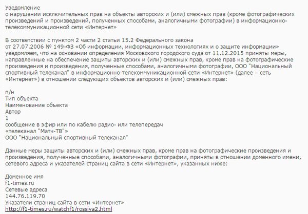 Говорят, что на добро отвечают добром, но не в нашем случае. Вскоре после того, как гонки Формулы 1 перешли на новый общедоступный и бесплатный канал «Матч ТВ» мы стали всячески привлекать наших читателей к просмотру этого канала и для наглядности встроили на одной из страниц код, позволяющий видеть, что там действительно показывают гонки. Вскоре к нам поступила жалоба и требование убрать эту информацию с сайта, так как это нарушает права телеканала, на что мы ответили согласием и вместо этого оставили ссылку на официальный сайт канала «Матч ТВ», где тоже можно свободно смотреть их трансляцию, ровно как и в любом другом месте, где есть телевизор и обычная антенна, так как по российским законам этот канал находится в свободном доступе для всех.