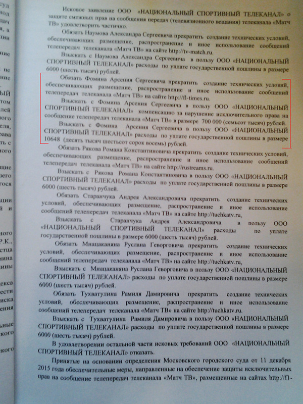 Позже мне стало известно, что обращение ко мне Роскомнадзора было связано с заявлением от ООО «Национальный Спортивный Телеканал», которое они направили в Московский городской Суд. По этому заявлению 11 декабря 2015 судьей Мосгорсуда было вынесено определение о принятии предварительных обеспечительных мер, направленных на обеспечение защиты авторских и (или) смежных прав на сообщения передач (телевизионное вещание) телеканала «Матч ТВ» на моем сайте, а также на нескольких других сайтах. По сути эти меры заключаются в том, что РОСКОМНАДЗОР обращается к хостеру с требованием удалить материалы, нарушающие права заявителя, иначе сайт попадет в черный список. Хостер, в свою очередь, передает эту информацию владельцу сайта.