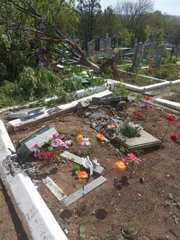 Военная техника второй раз проехала по местному кладбищу. Горожане опубликовали в соцсетях фото узувеченных памятников и могил.