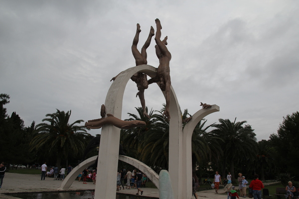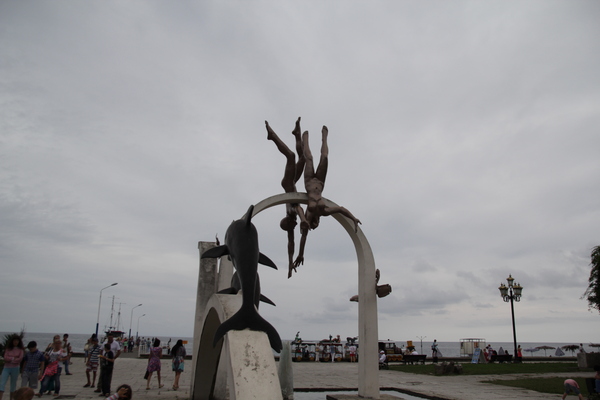 Памятник ныряльщикам. Нагие парень и девушка в окружении дельфинов, и разных рыб.