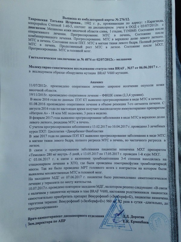 Врачи прописали препарат Вемурафениб (“Зелобраф”). Стоимость препарата - 864 855 тенге за двухнедельный курс. Курс лечения от полугода до года - до улучшения состояния. Сумма баснословная. Родителям и мужу Тани таких денег самостоятельно не собрать. Если вы сможете помочь Тане и перечислить небольшую помощь, то дадите девушке шанс на здоровую и счастливую жизнь.