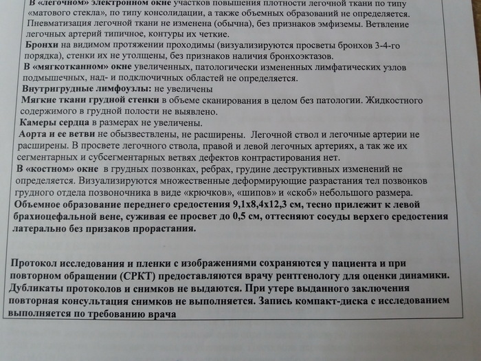 Относительно контрольной диагностики. После 4 химии сделала КТ. Делала по омс в Батайске, и все было вроде норм, пока в день перед госпитализацией не выяснилось, что на диск мне записали только шею, а самое главное, грудь забыли. От обиды и страха, что на химию не примут я даже мальца разрыдалась. Да так, что пришлось меня завдующей успокаивать и уверять, что химия будет по плану. Результаты КТ: