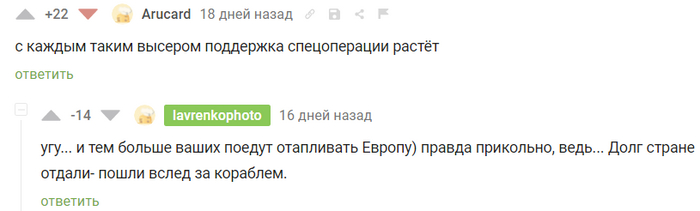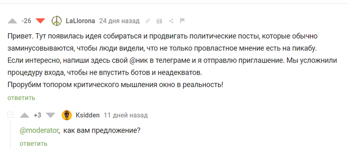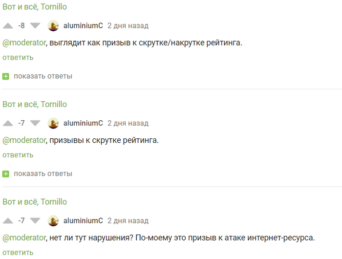 Буду благодарен за наводки на подобные комментарии/посты. я просматриваю десятки людей и сотни их комментариев, это довольно утомительно и не всегда приводит к результату. И да, они действуют сообща) я стал замечать одинаковые комментарии в разных постах от разных высокорейтинговых людей. Я не могу это показать, т.к. они остаются лишь в памяти и в момент нахождение второго такого же, первый уже слишком далеко в истории браузера. Но постараюсь сохранить.