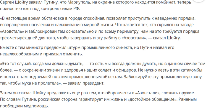 Не знаю, почему нельзя сделать заголовок, типа: Путин отверг предложение штурмовать завод наземной живой силой (или как назвать живую армию, простите если это звучит обидно)?