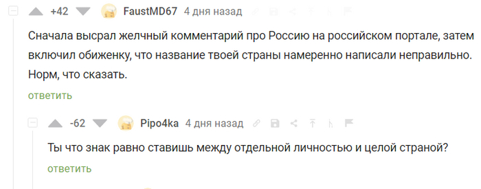 Так кто же ты на самом деле? Ладно, это менее важно, можно списать на незнание значения слова Родина. Я начал это все лишь для того, чтобы ответить на твои довольно грубые комментарии, вроде этого и этого, которые также довольно двойственны:
