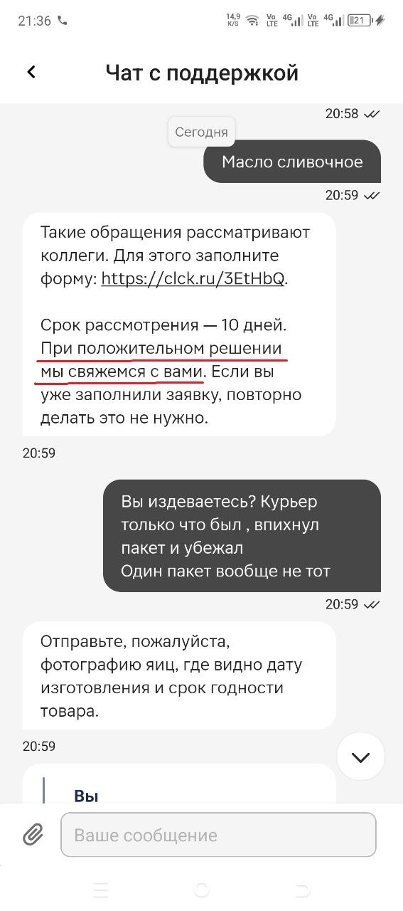 Отец звонит расстроенный, рассказывает всю эту безумную историю и я сразу написал в поддержку. Деньги вернули только за тухлые разбитые яйца. За остальное деньги решили не возвращать - будут рассматривать 10 дней и только в случае положительного решения со мной свяжутся. ВАУ. Вот это сервис, магнит!