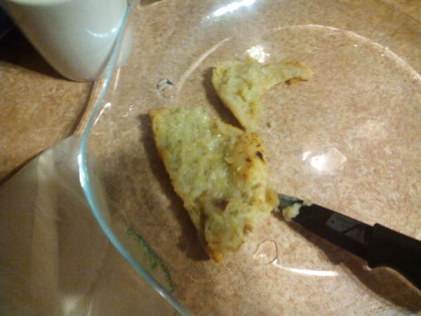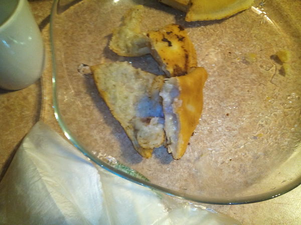 И вот я их кидаю на сковороду. Проходит некоторое время - и один из чебуреков лопается с выделением подозрительно белой начинки! Достаю и изучаю: