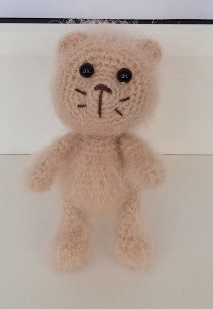 У Крысопса появился друг Кот, ростом 10 см, связан по бесплатному МК brooch_cott. Нитки Кид Мохер, наполнитель холлофайбер, глаза-пришивные бусины.