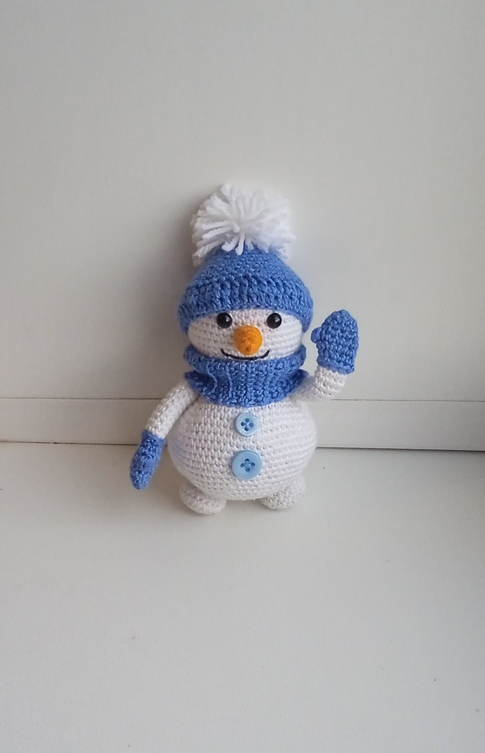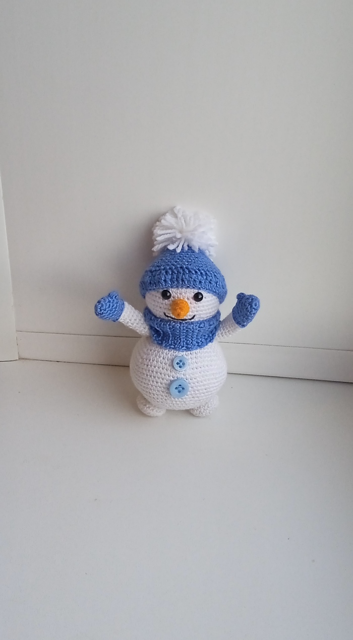 Рост около 30 см, связана крючком из Пехорки "Детская новинка", набита синтепоном, глаза на безопасном креплении. Волосы можно расчесывать и делать разные прически. Из одежды снимается только шапка и жилет.