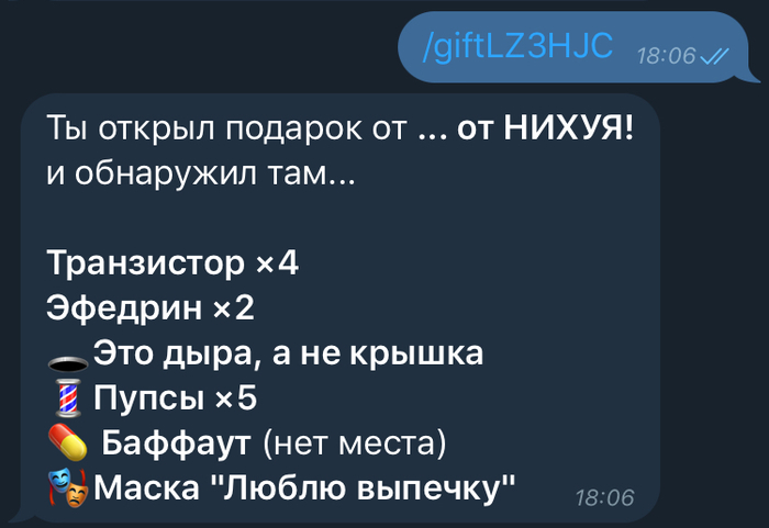 1754 DiMitchell Когда разработчик воплощает в жизнь старый игровой мем 7 лет назад Сегодня на Игромире создатель игры в телеграмме Wasteland Wars раздавал всем пришедшим на встречу такие талоны. Однако бот принял код и... Жаль, что не все нихуя в моей жизни столь обильны на подарки Показать полностью 2 [моё] Игромир Wasteland Wars Игры Талончик Подарки