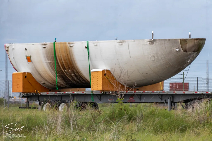 Активная половина обтекателя Falcon 9 после извлечения из воды направляется в цех для проверки и повторного использования.