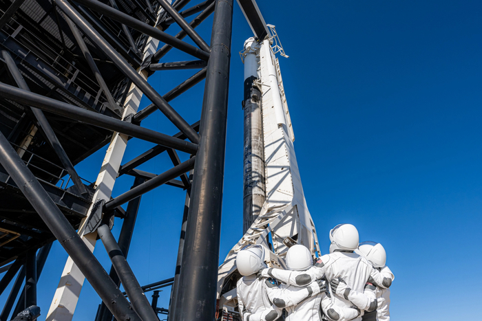 Экипаж оденется в скафандры, и будет доставлен на стартовую площадку, где займет свои места на Crew Dragon.