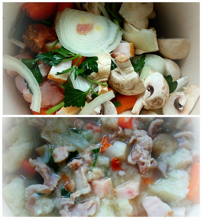 Через 15 минут у вас получается очень ароматный суп, в который надо покидать кусочки хлебного мякиша, предварительно вычерпав часть бульона (~250мл. Одна большая чашка).
