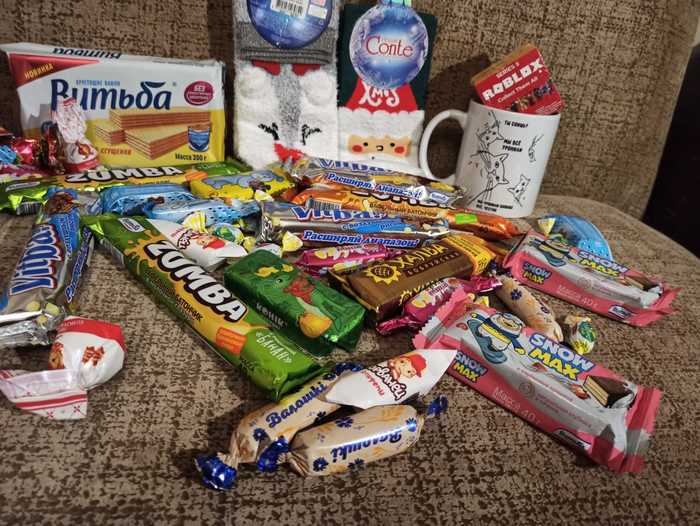Сказала дочери ,что ей только носочки и роблакс. Но ее это не ограничило и она забрала половину шоколадок и суперскую кружечку (когда я открываю глаза это и вижу).