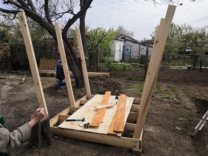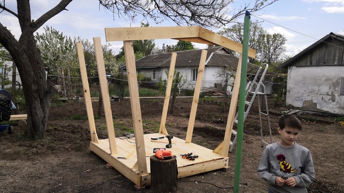 Молодой потомок пробует пол на прочность. Перед тем как прикручивать доски по краям ставлю опоры, креплю на болты насквозь. У меня угол 10 градусов от вертикали. Перед постройкой читал материалы по беседкам, везде пишут, что надо 15, но мне показалось, что многовато. В итоге не пожалел о своём решении - 10 градусов самое то: