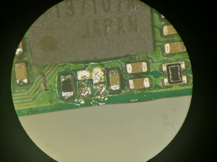 Здесь, на сколько помните, была окись. Я боялся что после ванны вся она не ушла из под микросхемы выше (если была там) и перекатал её. Справа от отсутствующего элемента (это я его отломал:)) ) мне не понравился кондик (вертикально стоящий). Я его слегка трогаю, на одной ножке стоит уверенно, а на второй нет. Смотрим.