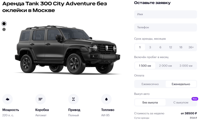 Свинота - самый дешёвы вариант 1800 в сутки. Херри 7 - 3300р/сутки, но на полном приводе. Танчик 300 - что-то на богатом написано, я не смог прочитать, но бричка прикольная (5100/сутки).