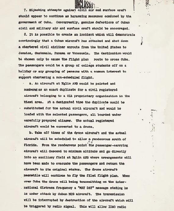 Пункт 8 в документе. "Мы должны создать такой инцидент, который убедительно будет демонстрировать, что кубинский истребитель атаковал и сбил чартерный гражданский самолёт на пути из США в Ямайку, Гватемалу, Панаму или Венесуэлу. Направление рейса должно быть выбрано таким образом, чтобы он проходил через Кубу. Пассажирами рейса должны быть представлена группа студентов колледжа на каникулах, или другая группа людей, объединённых общими интересами, чтобы обосновать необходимость чартерного рейса"