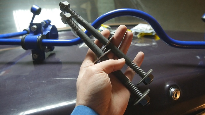 Оказалось, что производитель при спокойно в комплект кладёт шпильки, которые физически не пролазят в лонжерон))) Разница диаметра по телу и по резьбовой части почти миллиметр. Т.е. Вам нужно будет, либо изготовить шпильки самостоятельно, либо проточить уже купленные у токаря! Неожиданно, но факт.