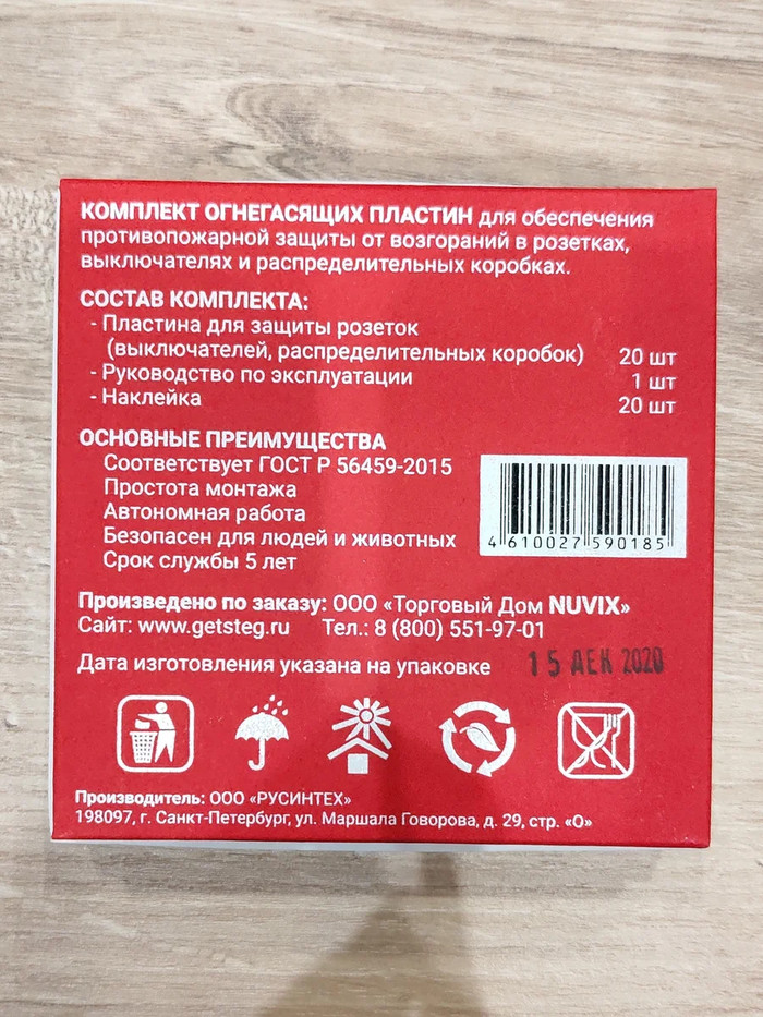 Наткнулся на ozone на интересный товар (я очень много покупал там товаров для ремонта) "противопожарные пластины Steg". Описание прямо скажем фантастическое, какие-то маленькие пластины способны остановить возгорание внутри розетки.