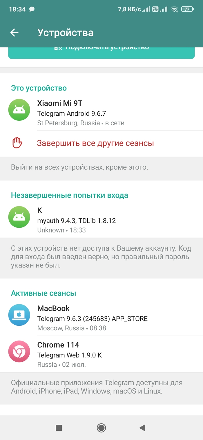И тогда я уже напрягся. А через пару секунд всё понял: у меня попытались угнать аккаунт Телеграма. Как же хорошо, что когда-то давно я установил этот дополнительный вопрос! Разумеется, тут же был осуществлён разлогин из незавершённой попытки входа: