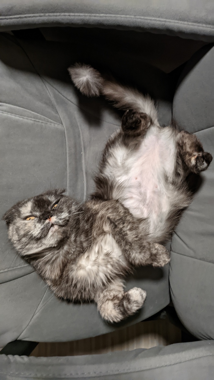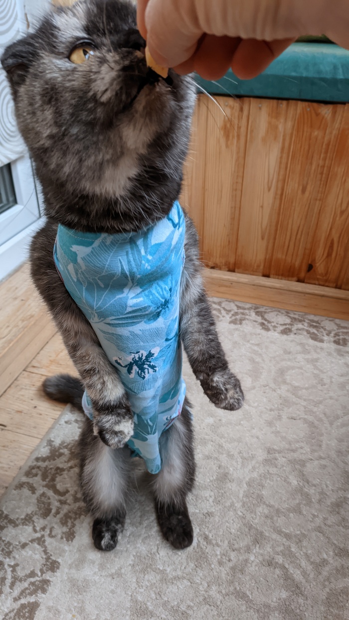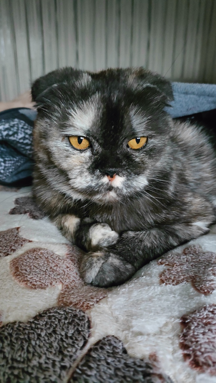 Всем привет. Два месяца назад иду с женой в магазин и тут жен говорит: "Смотри, в окошке подвала кошка вислоухая сидит." Решил подойти поближе, кошка сидит, не убегает. Я ещё ближе, кошка замяукала и ко мне потянулась. Ну я её и взял на руки. Она ко мне прижалась и замурчала. Видно, что голодная, блохастая, жуть просто. Короче, не смог я её отпустить и принес домой я эту подлизу. Поселил на карантин на лоджии