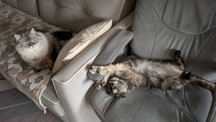 На руках сидеть теперь не любит, а сначала сама просилась. Со второй кошкой не дерется, могут пошипеть друг на друга, но в принципе уживаются.