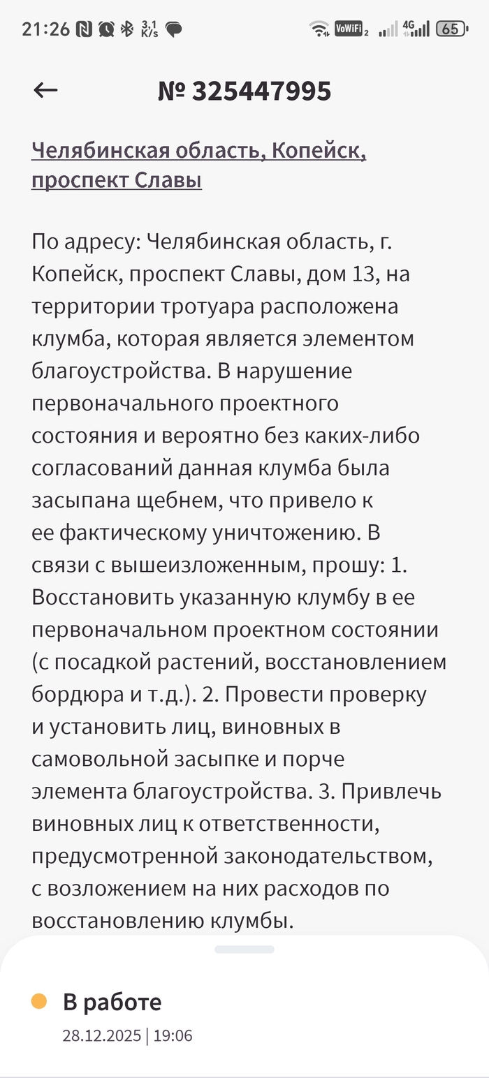 На платформе "Решаем вместе" я направил обращение с требованием к администрации восстановить испорченную клумбу. Этот шаг запустит определенный бюрократический механизм, администрации придется либо восстановить клумбу, либо она пришлет отписку. Если восстановит в период весеннего сезона, когда обычно и выполняются подобные работы - будет просто отлично! Если будет отписка, то напишем жалобу в прокуратуру на бездействие.