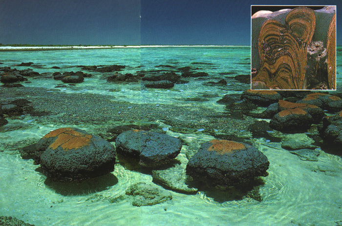 Современные строматолиты в заливе Шарк, Австралия. Сверху — разрез строматолитовой породы с характерными полосками бактериального мата.