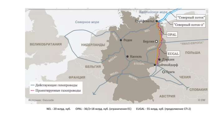 По каким причинам именно Германия оказалась на острие удара, почему политики именно этой страны чаще всего выступают за то, чтобы СП-2 был введен в эксплуатацию как можно быстрее? Тоже никакой конспирологии – просто нужно помнить о том, что СП-2 строят не для того, чтобы в море возле Грайфсваальда пузыри выдувать. Первое наземное продолжение СП-2 – это МГП EUGAL, в строительство которого консорциум из четырех немецких компаний вложил еще 2,7 млрд евро, не считая затрат на выкуп земельных участком и на финансирование всяческих соглашений с правительствами федеральных земель, по территории которых он прошел. Текст про суды, про банковские проценты, про упущенные выгоды повторять не буду – считайте, что он тут рефреном звучит. EUGAL доходит до территории Чехии, при этом имеет ветку в направлении Берлина мощностью в 10 млрд кубометров в год. Ветка нужна не только для того, чтобы обеспечить газом потребителей столицы Германии, но и для того, чтобы обойти известное ограничение газовой директивы ЕС, согласно которому один поставщик не имеет права бронировать более 50% мощностей транзитного трубопровода. Именно это положение – причина того, что ЕК время от времени ограничивает работу МГП OPAL, сухопутного продолжения СП-1. Но если газовая магистраль используется внутри страны – она уже перестает быть транзитной.