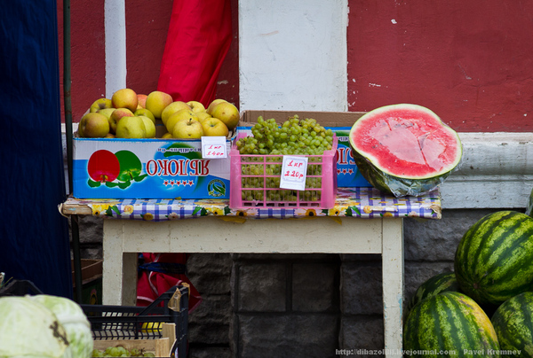 Цены на продукты. Почти все фрукты и овощи привозят в Магадан с "большой земли", вечная мерзлота не позволяет городу прокормить себя. Первый раз в жизни увидел, что арбузы продают половинками: целый дороговато выходит... Ради справедливости стоит сказать, что и зарплаты в Магадане некислые. Например, среднестатистический таксист редко имеет менее 3000 долларов в месяц.