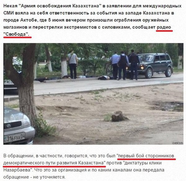 Некая "Армия освобождения Казахстана" в заявлении для международных СМИ взяла на себя ответственность за события в Актобе. В обращении, в частности, говорится, что это был "первый бой сторонников демократического пути развития Казахстана" против "диктатуры клики Назарбаева".