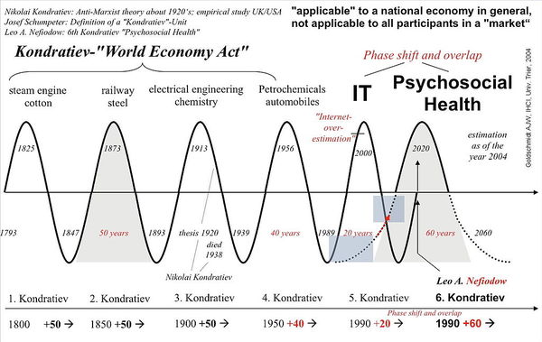 Вторая — периоды повышательных волн больших циклов, как правило, значительно богаче крупными социальными потрясениями и переворотами в жизни общества (революции, войны), чем периоды понижательных волн.