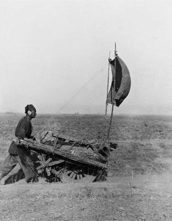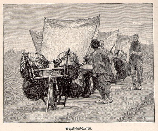 Разумеется, как и любое изобретение, китайская тачка была объектом усовершенствований, как вам парусная тяга? :