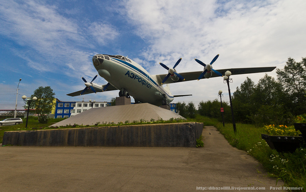 3. Перед аэропортом на постаменте установлена раритетная машина (причём, в весьма приличном состоянии), а на заднем плане на фотке как раз виден мой сине-белый клоповничек (решил остановиться рядом с аэропортом). Выложить пришлось 2500 за 1 ночь в одноместном, весьма прокуренном номере с общей на два номера ванной комнатой. Дешевле в Магадане просто нереально ничего найти. А более всего в гм... отеле... запомнились брутальные металлические двери на входе в каждый номер и стрёмный контингент... Всякое повидал, но здесь реально возникало желание закрыться на два оборота ключа сразу, как вошёл в номер! Странно, ведь это были большей частью люди, прилетевшие в командировки. Или фирмы специально отправляют в Магадан именно таких сотрудников?