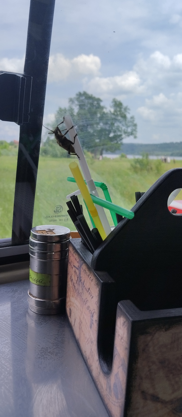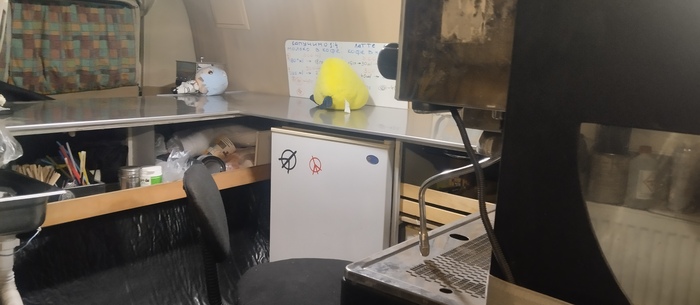 В салон через сдвижку. Справа бочина кофемашины, прилавок, за энгрибёрдс - шпаргалка, для приготовления напитков. Я не бариста - опыта мало, выезжаю не каждый день, все забываю. Задний угол - за куклой из аниме - кофемолка.
