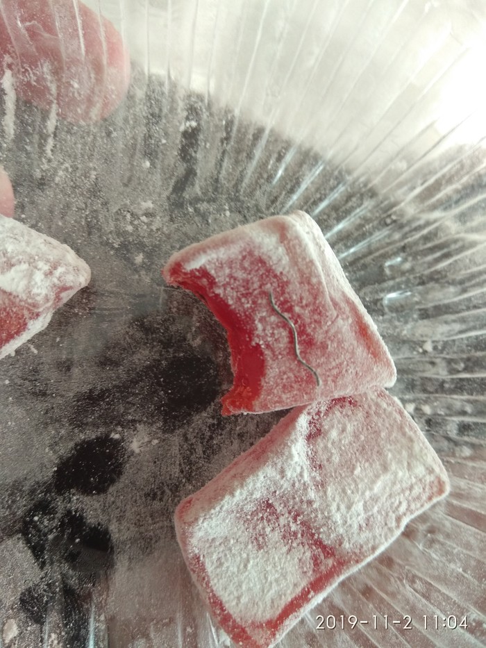 Купила жена Рахат-лукум, любит она эту сладость. Пила чаёк с ним, пока на зубах не почувствовала инородное тело. Это был кусок проволоки. Я благодарю его счастливый случай, что она её не проглатила, жена находится в положении и кто знает чем бы могло это обернуться.