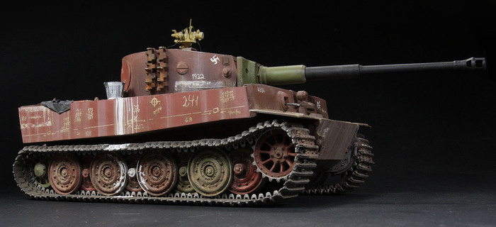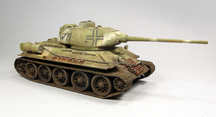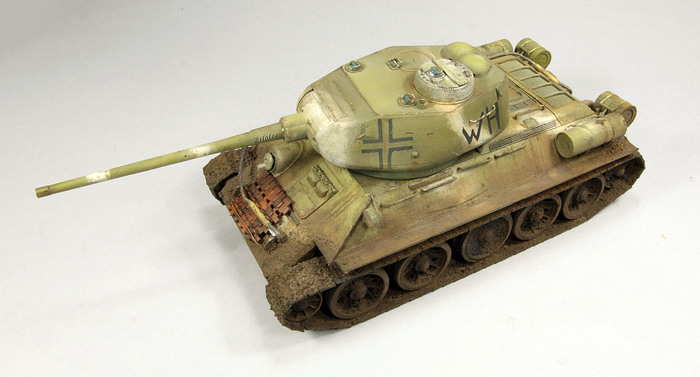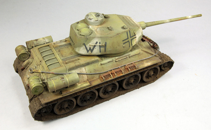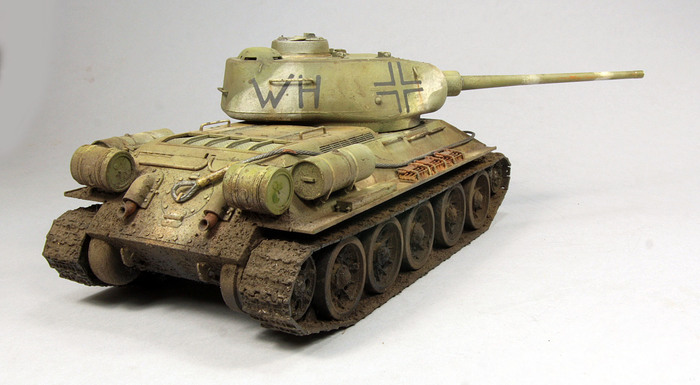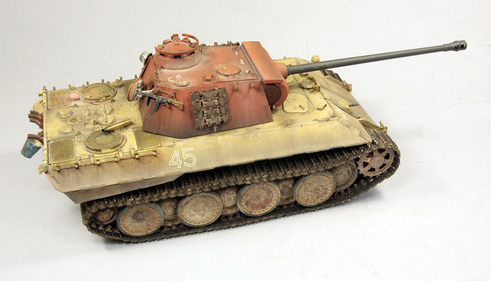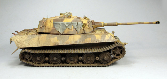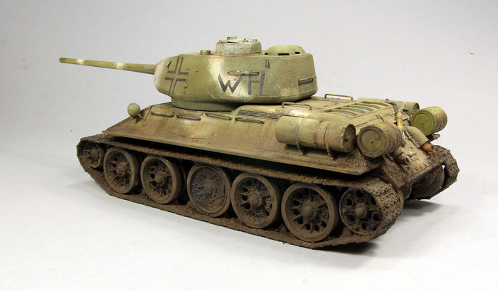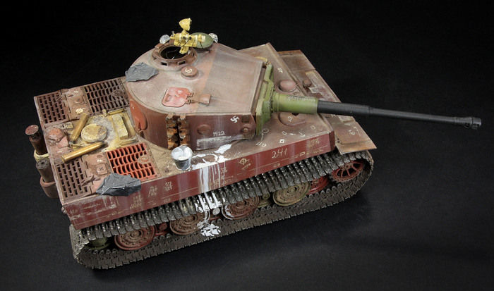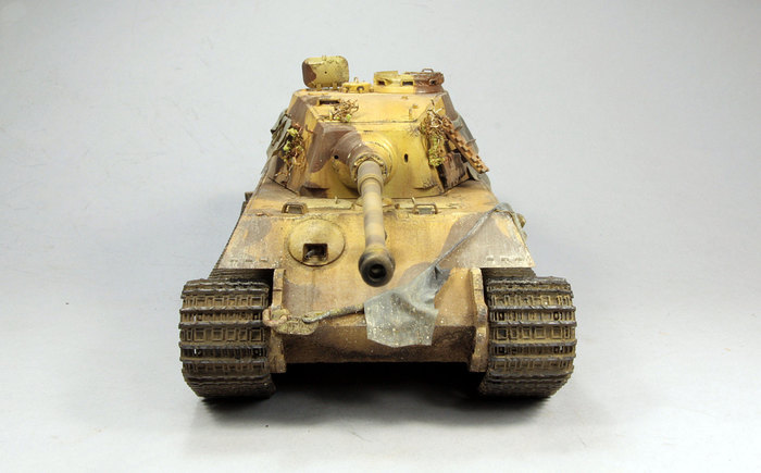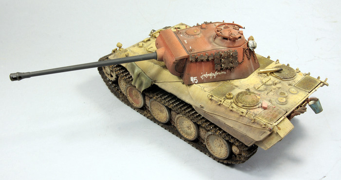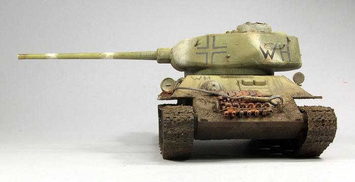 Борта и маска орудия и некоторые выступающие части были выкрашены в базовые немецкие цвета. Этим я хотел показать, что немцы всё же попытались покрасить танк в базовый цвет, но не успели доделать.