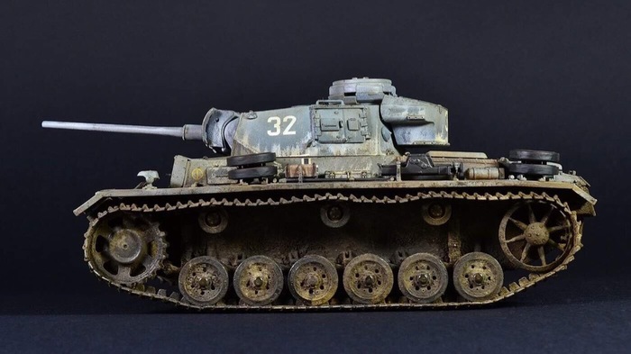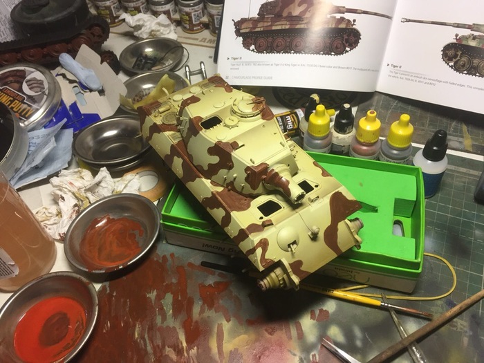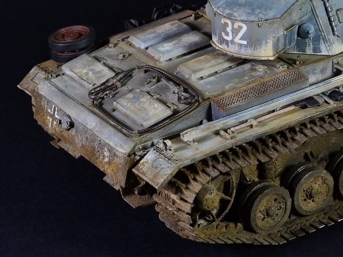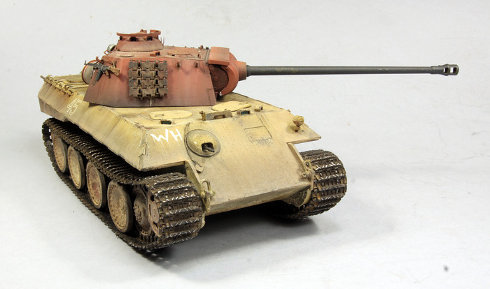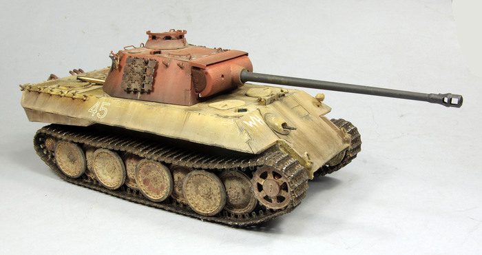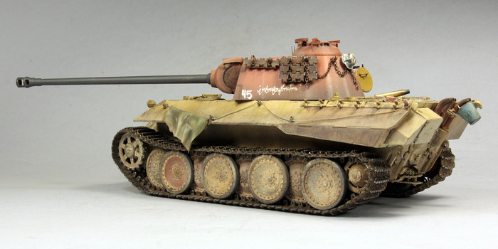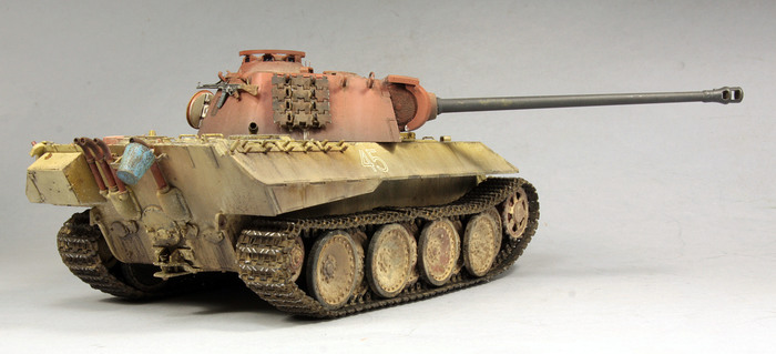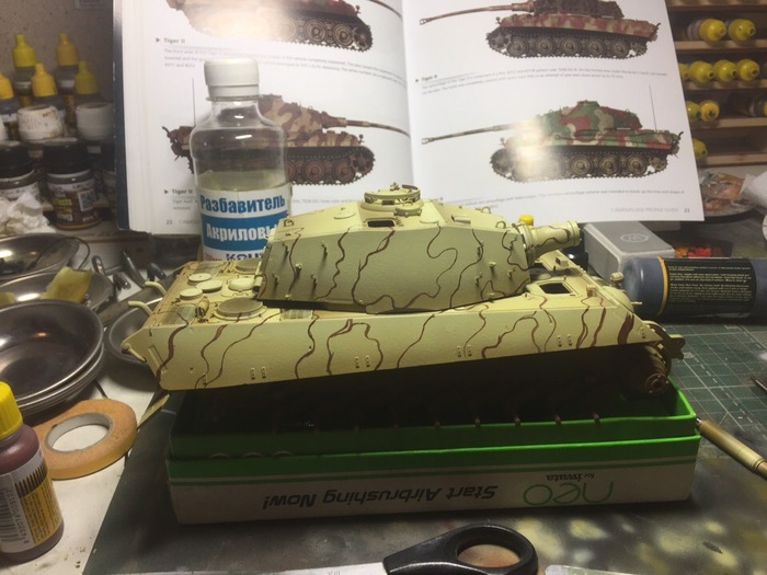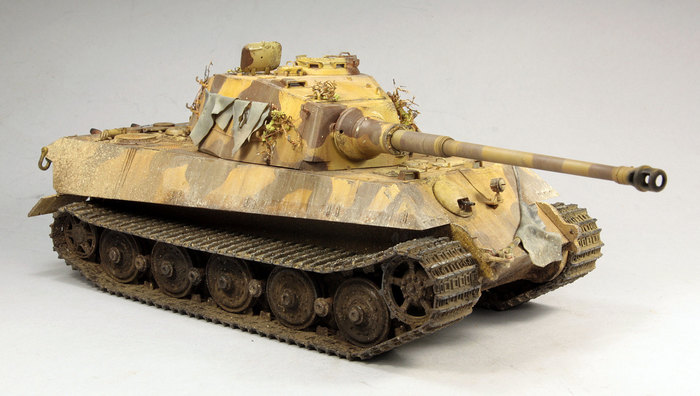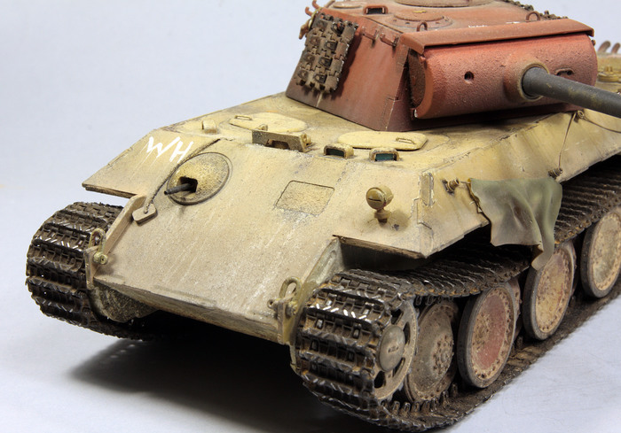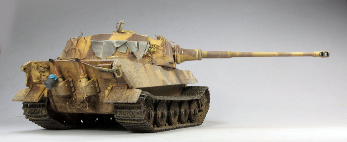 Борта и маска орудия и некоторые выступающие части были выкрашены в базовые немецкие цвета. Этим я хотел показать, что немцы всё же попытались покрасить танк в базовый цвет, но не успели доделать.