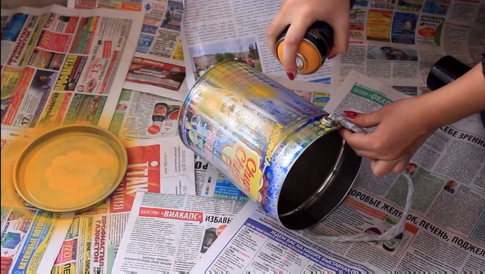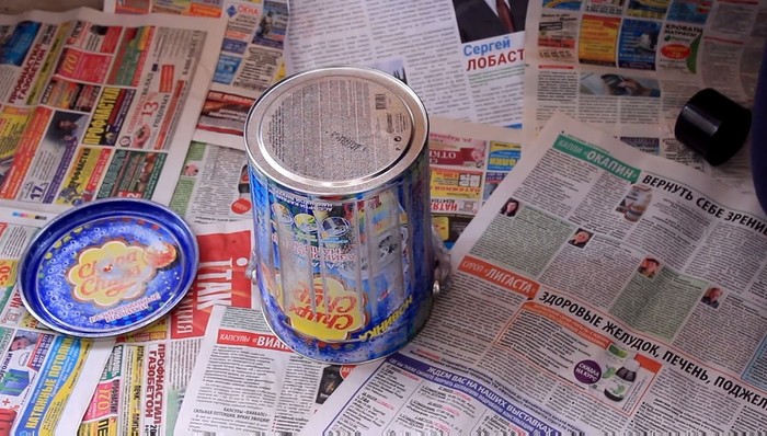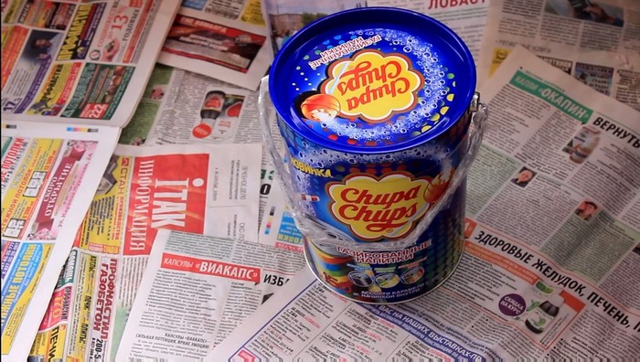 Для начала я взяла самое обычное ведерочко от чупа-чупсов (не реклама, какое уж было), а вы берите ведерочко какое найдете. Ручку заклеим скотчем чтобы не запачкать. Пол щедро посыпим газетами, которые вечно залазают каким-то образом в почтовый ящик.