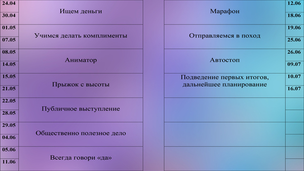 В последнее время, как вы могли заметить, стало модно самосовершенствоваться. То и дело вконтакте можно увидеть рекламу пабликов "Миллион за год", "100 целей за год" и тому подобное. Я решила заняться чем-то подобным. Разница лишь только в том, что я не буду преследовать никаких материальных выгод. Я просто хочу провести некоторый эксперимент над собой. Каждую неделю я буду проводить одно конкретное задание. Некоторые задания могут быть необычными или даже глупыми, но они все преследуют цель, которая будет развивать во мне какие-то качества или умения, да и просто задания должны расширять мою зону комфорта.