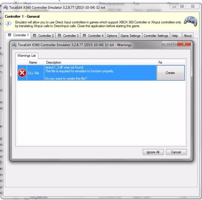 Запускаем его ото имени администратора. Выскочит предупреждение что не нашло библиотеку xinput. Нажмите "Create"