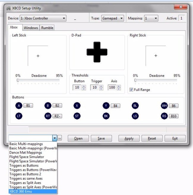 В нижнем левом углу из выпадающего списка нам нужно выбрать "XBCD 360 Emu"