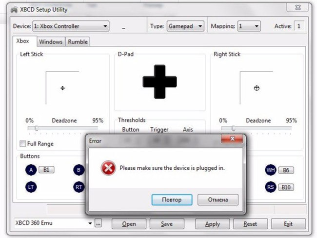 После чего нажимаем кнопку "Apply" может выскочить сообщение что контроллер не найден. Просто отключите его от пк и снова подключите. И нажмите "Повтор"