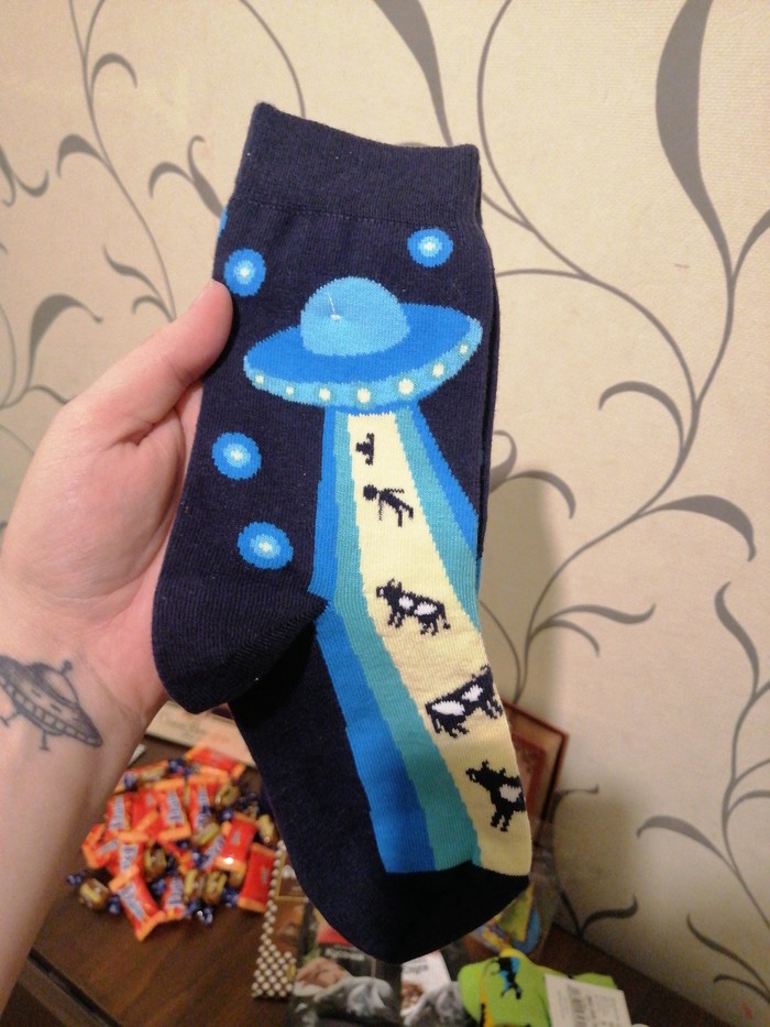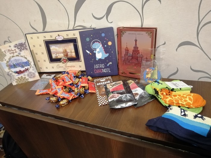 Это моё. Было раньше Полинкино и Питера, а стало моё, в мой день рождения. Чай в жестяной шкатулке, ежедневник со смешным динозавром-космонавтом, конфеты с Питера, я загляделась... Была в СПб, но так давно, замечательный город. Нашему Андрейка носки. Нет, НОСКИ. Они нереально крутые! Коша и кот сказали спасибо, Полин, уже нет еды. Спасибо тебе, дорогой человек, за праздник! Ждём в гости.