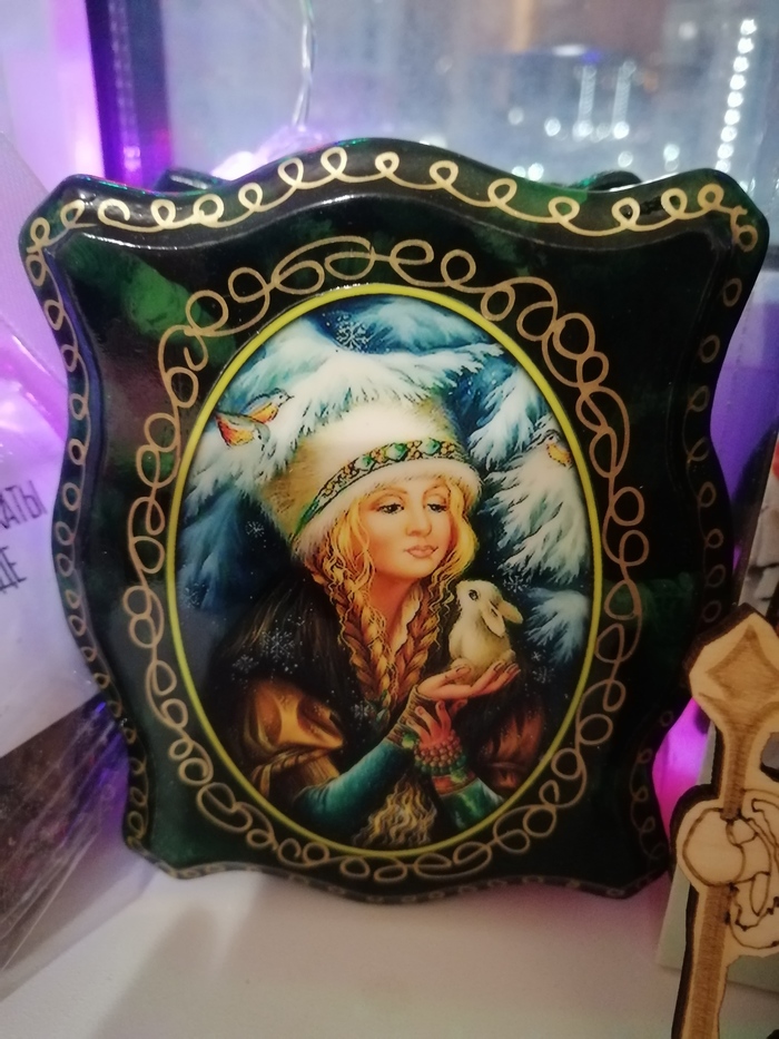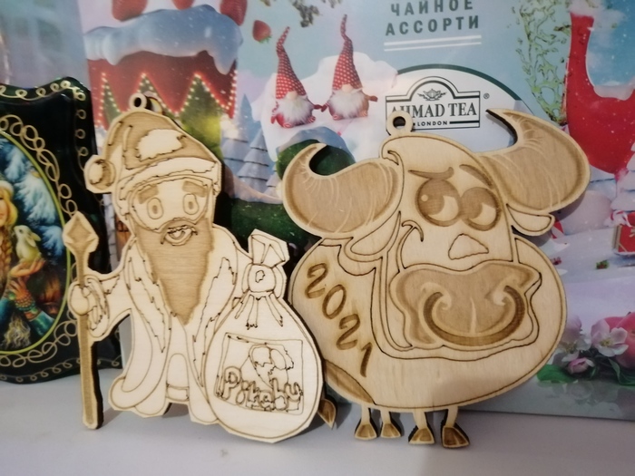 чаем, я таких у нас не видела, уже пила со сливой, вкусненько и очень мило🙃. Магнитик не сфоткала, каюсь, так как сразу прилепила (примагнитила? повесила? Как?) на холодильник. Открытка, тёплая, новогодняя открытка, как же это приятно, а. У Славы есть мама, а мамы есть талант. Полюбуйтесь, какую шкатулку она сделала! Теперь шкатулочка моя, на долгие-долгие годы. Мама, спасибо Вам, шкатулка просто восторг! А мой Дед Мороз сам изготовил две ёлочных игрушки с символом бычка и пикабушного Деда Мороза! Ну прелесть просто! Хватит слов, просто, любуйтесь, пожалуйста.