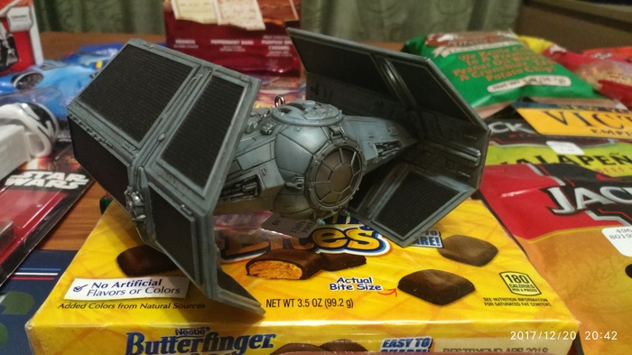 Елочная игрушка в виде истребителя на котором летал........ Вейдер! Есть отдельная коробка, с блоком питания, если все подключить, то он мигает и издает звуки из фильма, а если начать на кнопку сверху, то Вейдер выдает пару реплик из IV эпизода.