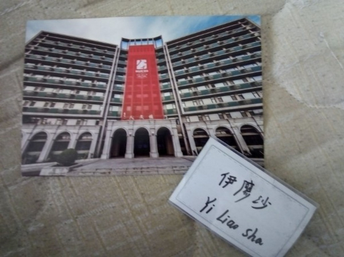 Открытка с изображением Пекинского народного университета, подаренная мне китайцем Бобом, а также мой бэйдж - такие носили все мы, чтобы к нам можно было обращаться. Позабыв, что существует английский вариант "Alex", я решил представится "Лёшёй", ибо "Алексей" показалось мне слишком сложным. Но почему-то я стал "Юляшей" (может "Я Лёша" так трансформировалось), в любом случае у меня было самое милое имя)