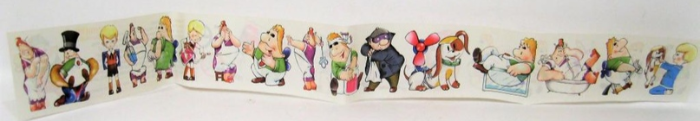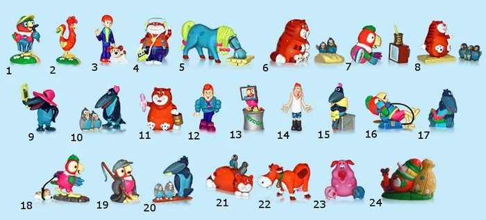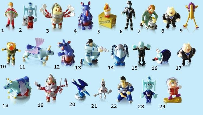 Новая коллекция вышла, конечно, не в 2004 году, а чуточку раньше - в 2003-м, уже до всей этой истории она была хороша знакома детям и их родителям. Об этом я немного написал в посте Сколько стоит фонарь под глазом или как порадовать ребенка . Тогда я рассказал лишь об одной игрушке, полностью же коллекция выглядела вот так (все также на вкладыше) :