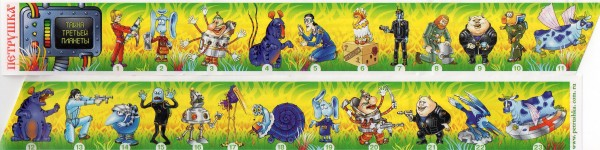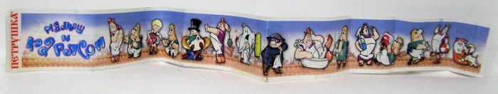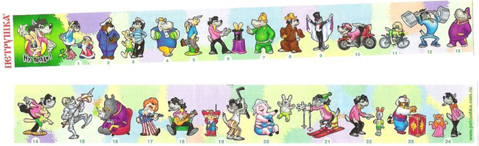 Также в каждом яйце (в каждом яйце была игрушка!) находился красочный вкладыш, с помощью которого ребенок не только мог позагадывать себе будущую игрушку, но и вполне легально ее обменять - существовала байка, что отправив три вкладыша можно получить любую понравившуюся игрушку из той же коллекции. Но я таких случаев не знаю и в основном люди пишут о том, что скорее всего это обман чтобы набрать классы просто маркетинговый ход. Однако во вкладышах было еще кое-что интересное - намек на игрушку самого "Петрушки", появляющегося от серии к серии в различных образах. Обладатель такого Петрушки мог рассчитывать на дополнительные бонусы от компании "Ландрин", но об этом чуточку позже